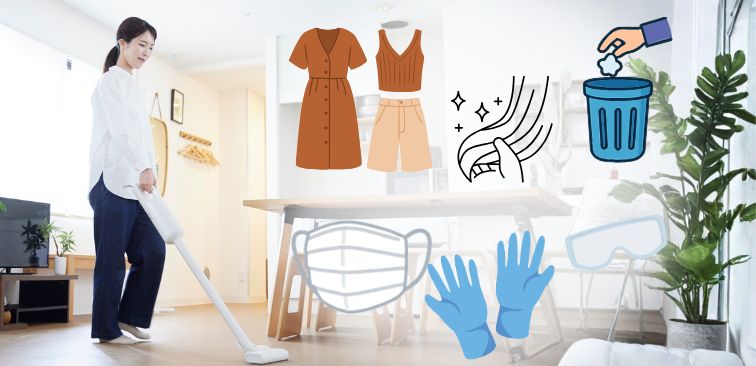 掃除の際は、外出着のまま行わずエプロンを着用したり掃除用の服に着替え、長い髪はまとめてバンダナなどを三角巾のようにかぶると安心です。