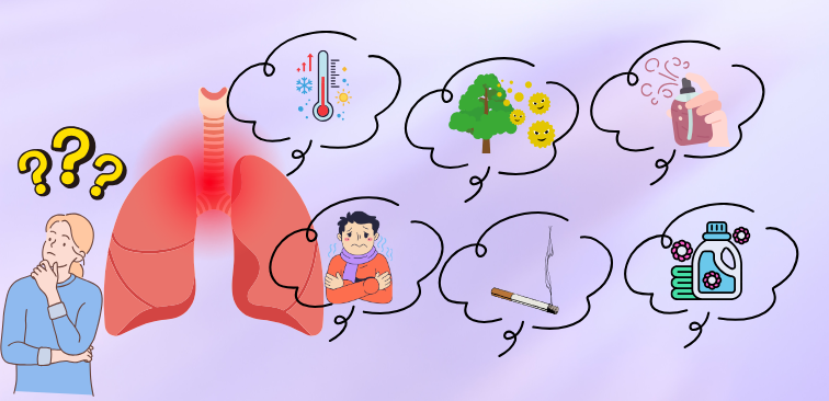 炎症のある気道は刺激に敏感で、普段なら問題にならないにおい・薬の成分・温度差などでも反応を起こします。