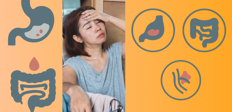 ストレスや薬剤(痛み止めなど)が原因で潰瘍ができ、出血する。