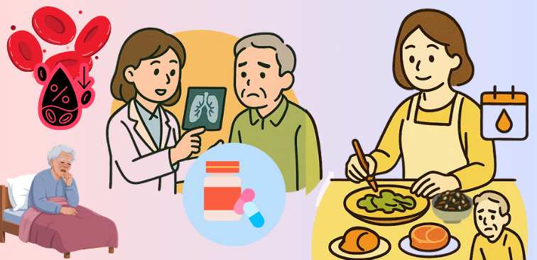 このように、原因を取り除くことで、貧血は改善に向かいます。特に高齢者の場合、咳が止まらず肺炎が隠れていることもあるため、呼吸器症状がある場合は早めの受診が重要です。