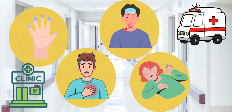呼吸困難:息切れや、チアノーゼ(唇や爪が紫色に変色)、呼吸が速く浅い、会話が困難なほど息苦しいなどの症状は一刻も早く救急受診が必要です。