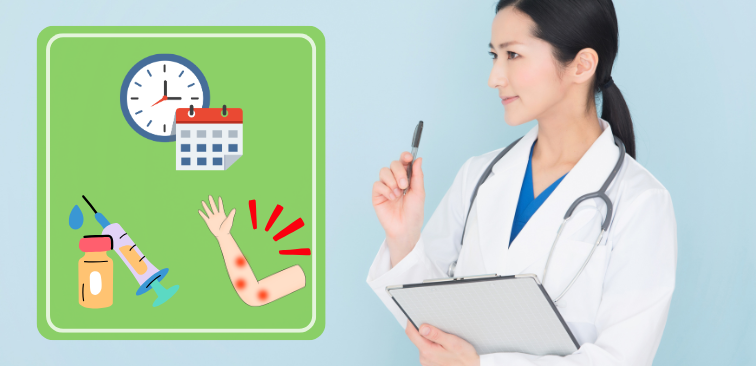 稀に重いアレルギー反応(アナフィラキシー)が起きる可能性もあるため、特に初回の投与は医療機関で慎重に行い、投与後もしばらく様子を観察します。
